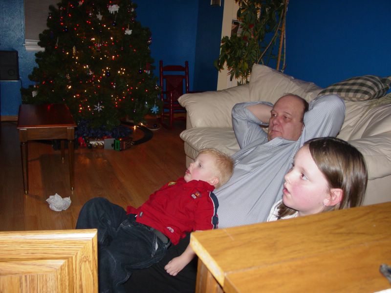 Dec 2004 -- Kaden, Chana, and Grandpa relax in front of the TV after dinner